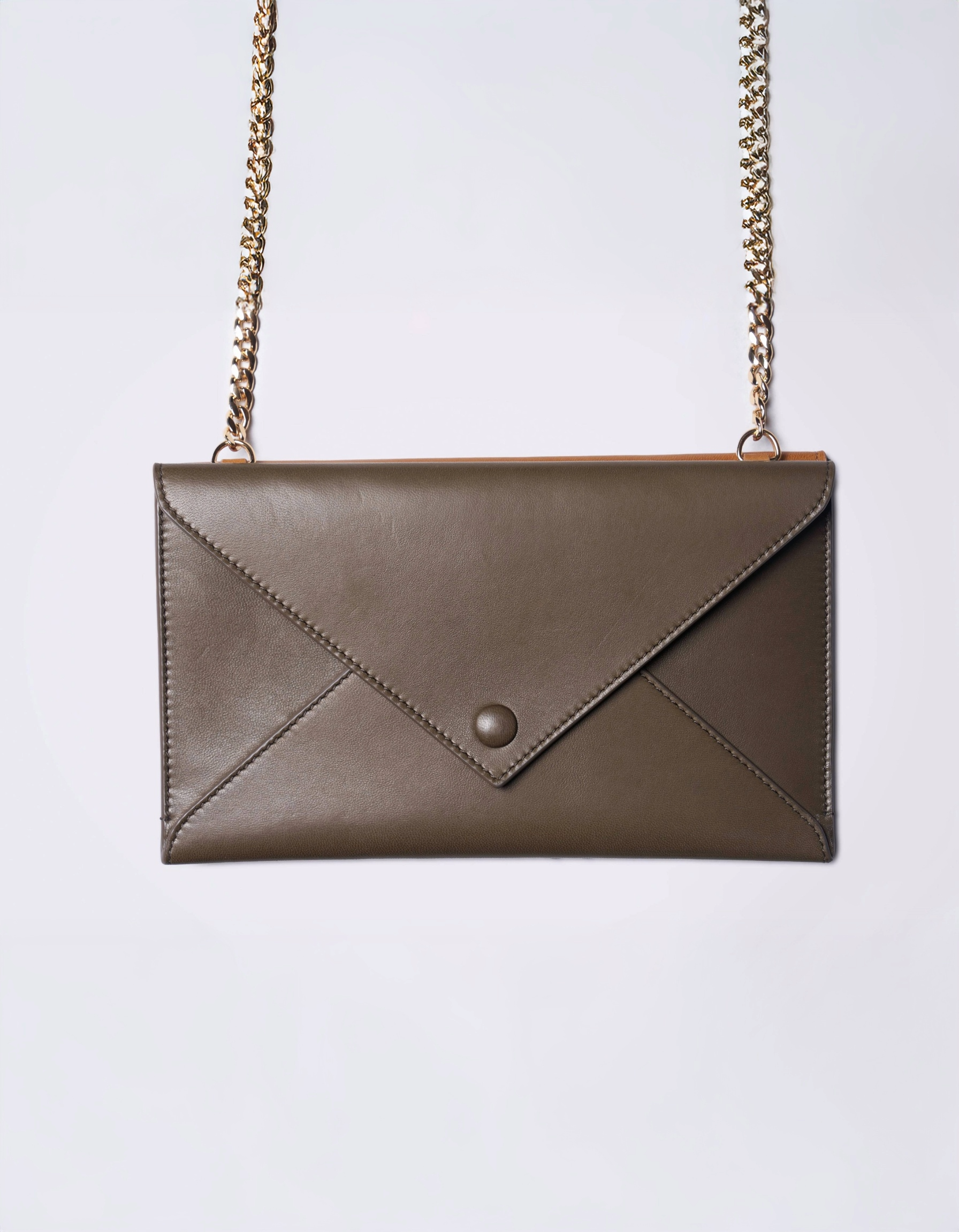Handmade in Italy, the Envelope Double Bag in Armagnac & Brown is crafted from smooth leather and designed as two detachable envelope pouches that can be worn together or separately. For day, wear the pouches together to create more space; for evening, when you only need your essentials at hand, unclip one of the pouches. The structured, refined silhouette is complemented by a gold chain strap, allowing the bag to be styled on the shoulder or crossbody. The dual colour adds extra versatility, allowing it to shift with ease between different looks.