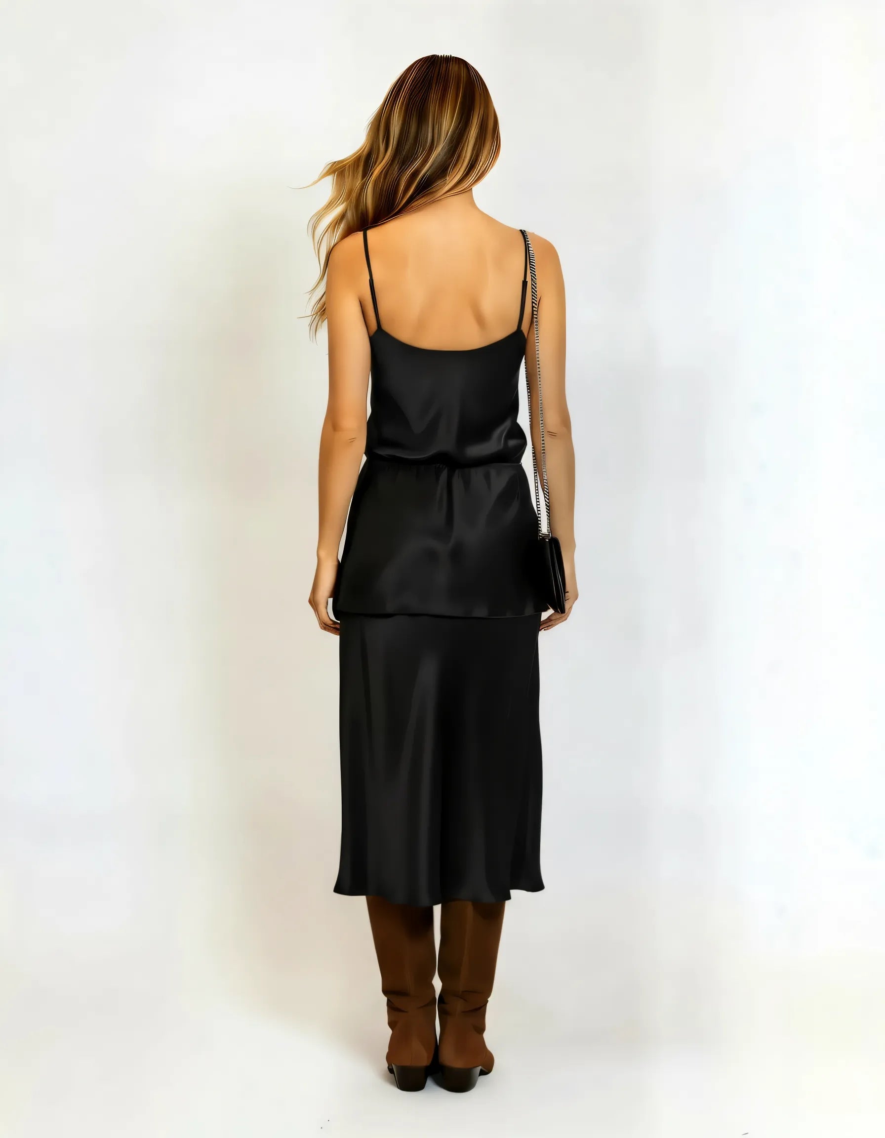 Made in France, the Angie Top is crafted from sustainable hammered black satin. The silhouette is minimal and refined, designed to contour the body, while a subtle sheen enhances the texture of the fabric.