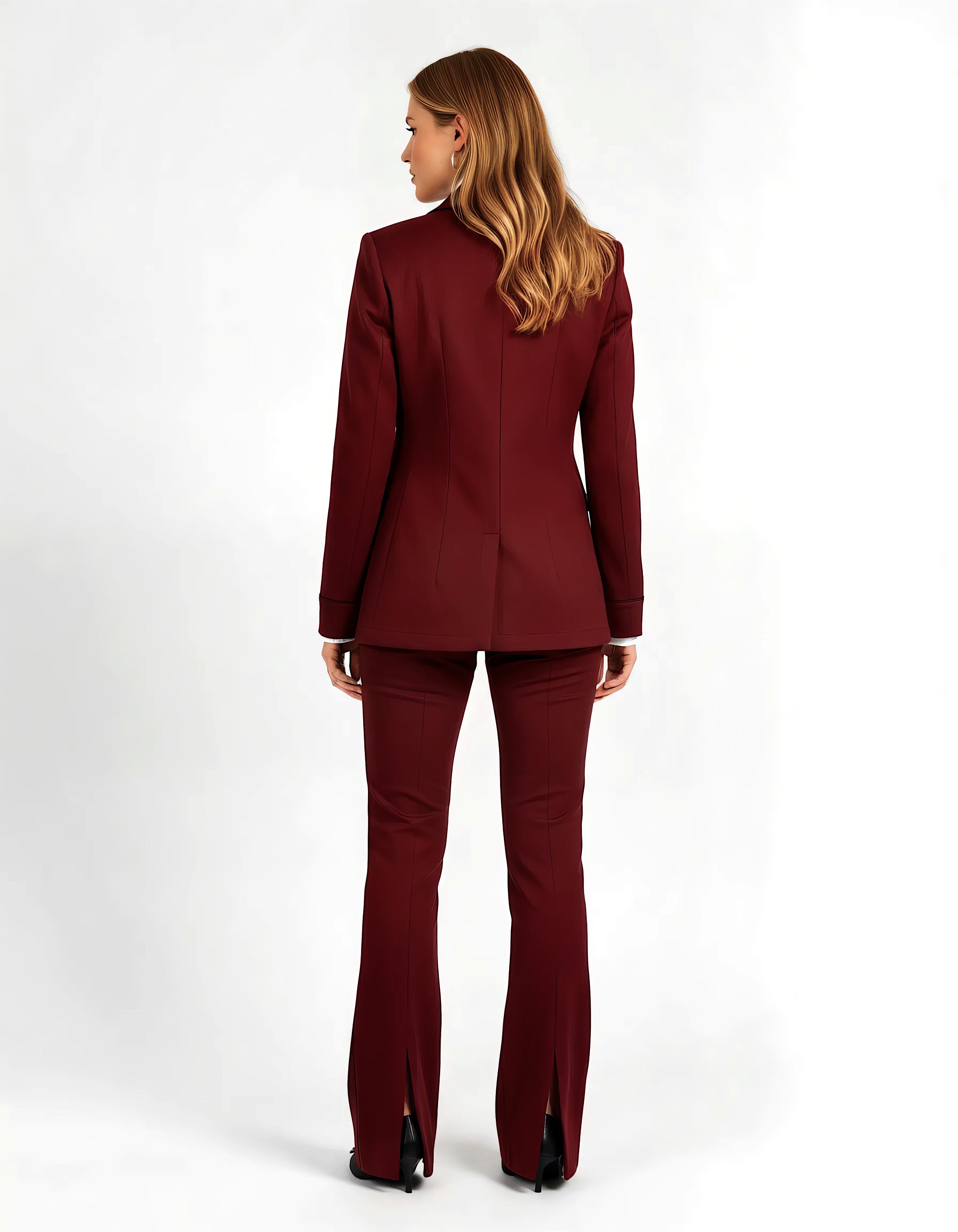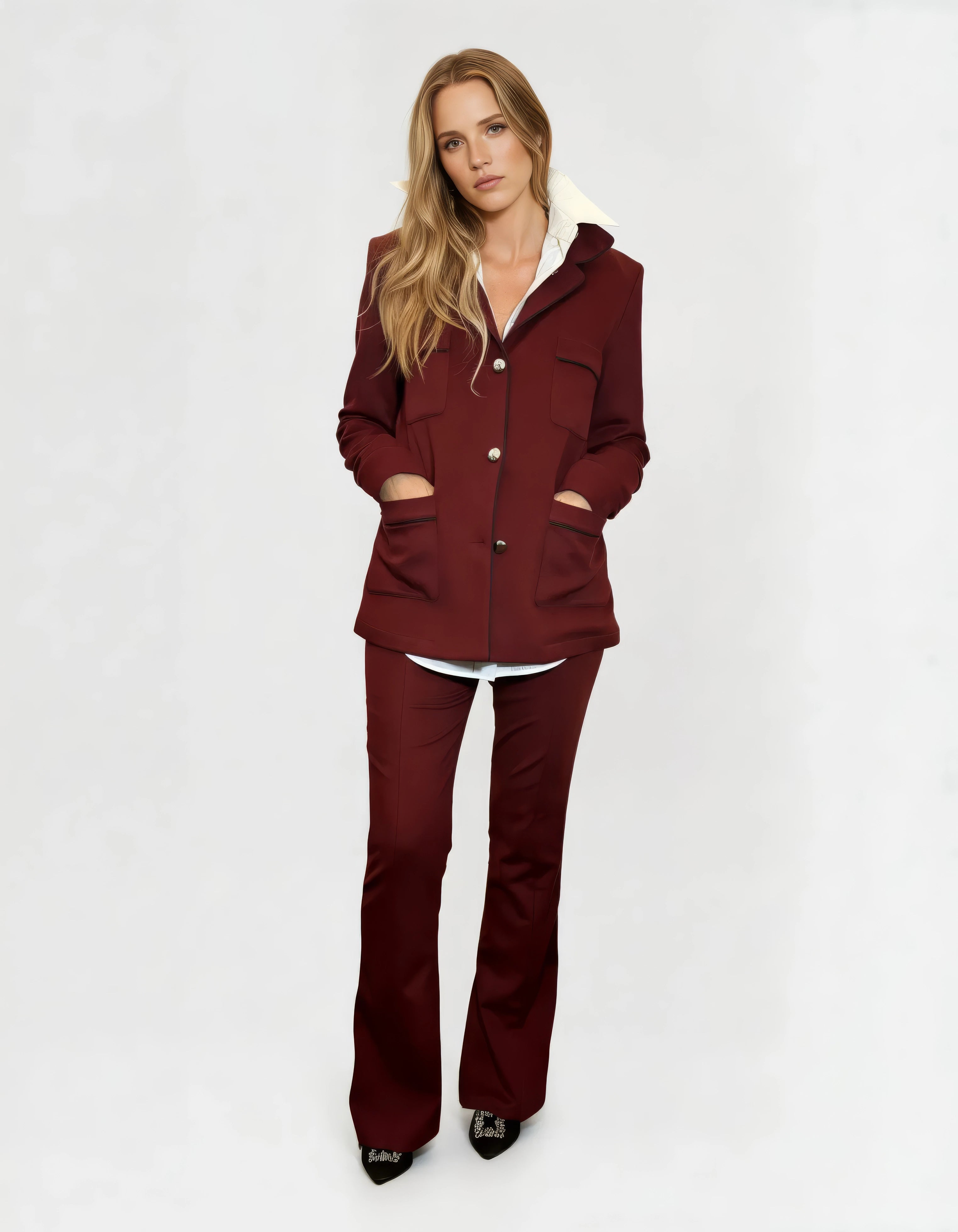 Handmade in Paris, the Anne Pyjama Jacket is crafted from pure cashmere in a deep wine-red hue, accented with black piping. The silhouette is softly structured yet relaxed, allowing the jacket to drape elegantly against the body. A tailored collar, button front, and piped edges evoke classic loungewear codes reinterpreted through a modern lens.