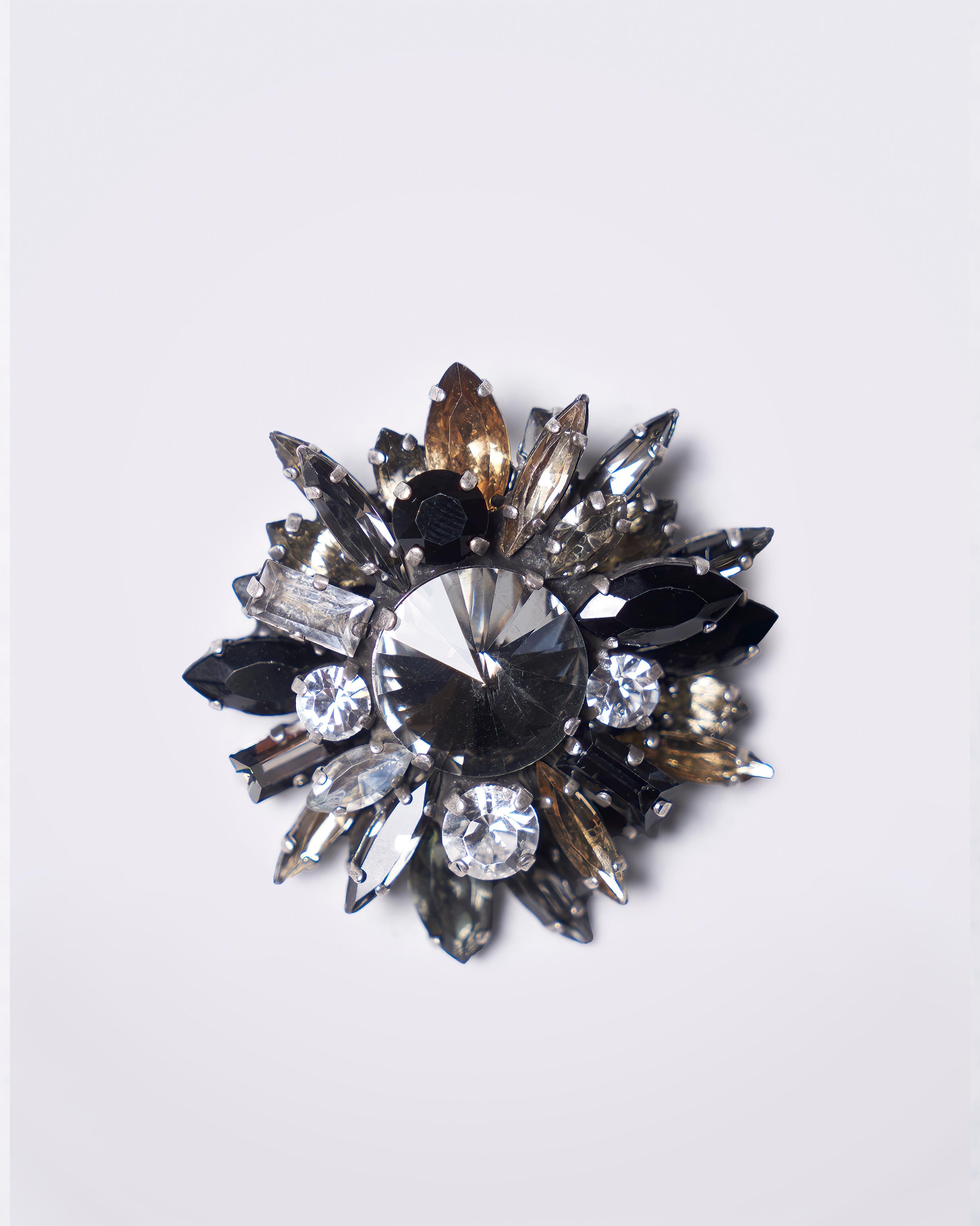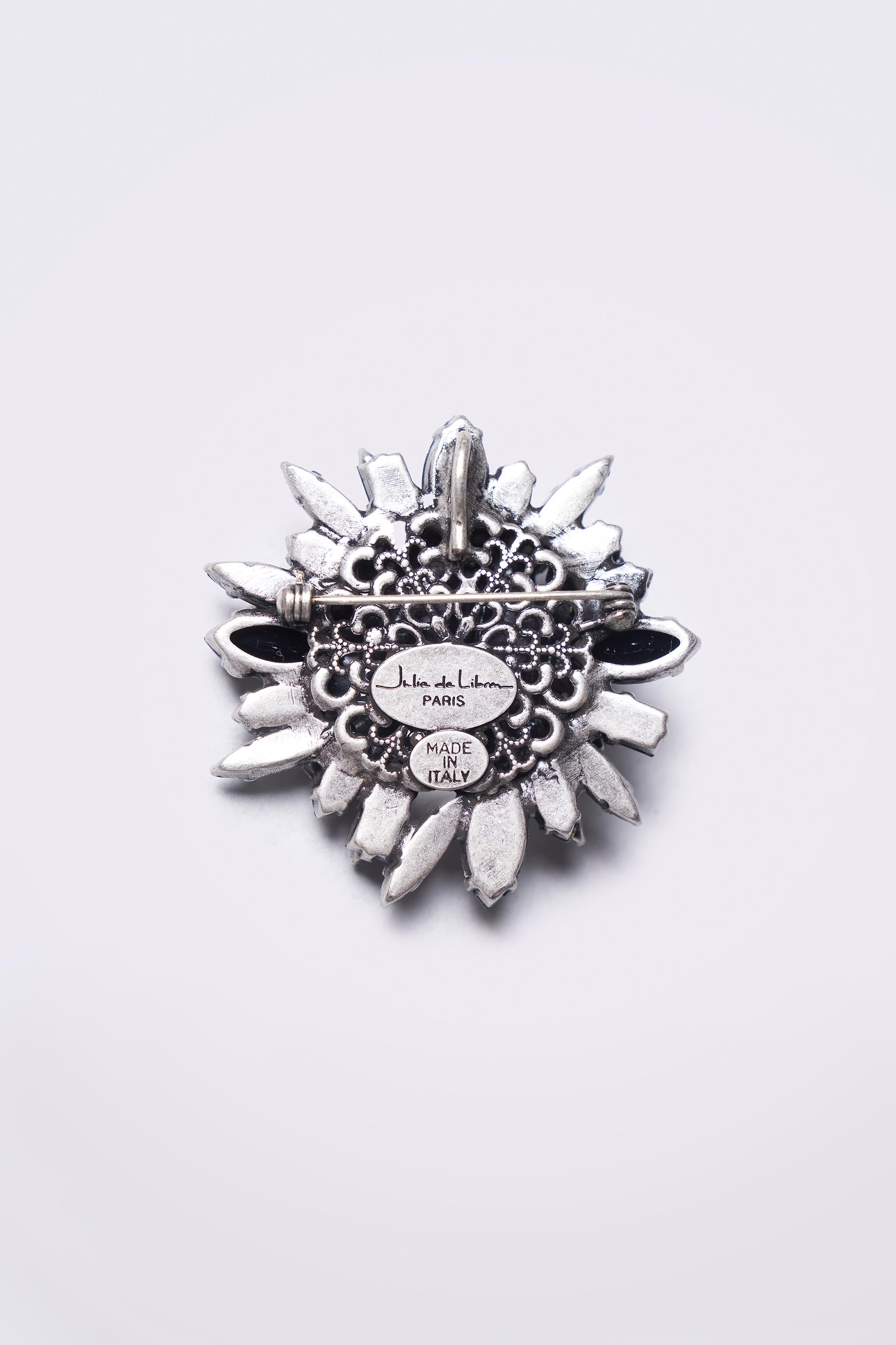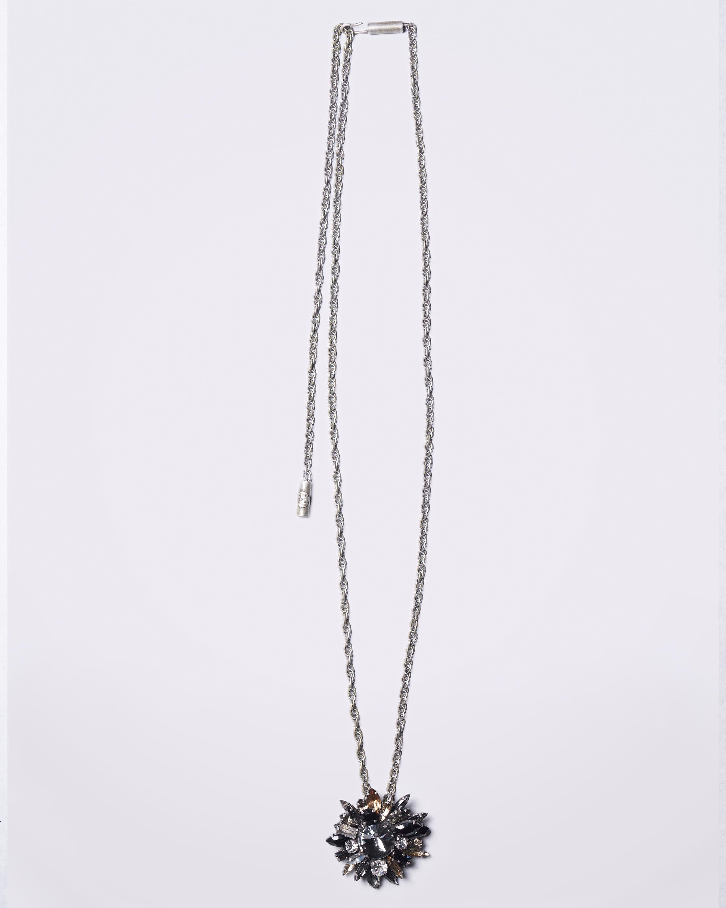 Crafted in Italy, this crystal fumé and black jet necklace is designed to be worn both as a brooch and as a sautoir on chain. Composed of coloured crystals set in brass, this versatile piece brings a considered finishing touch to both tailored and fluid silhouettes.