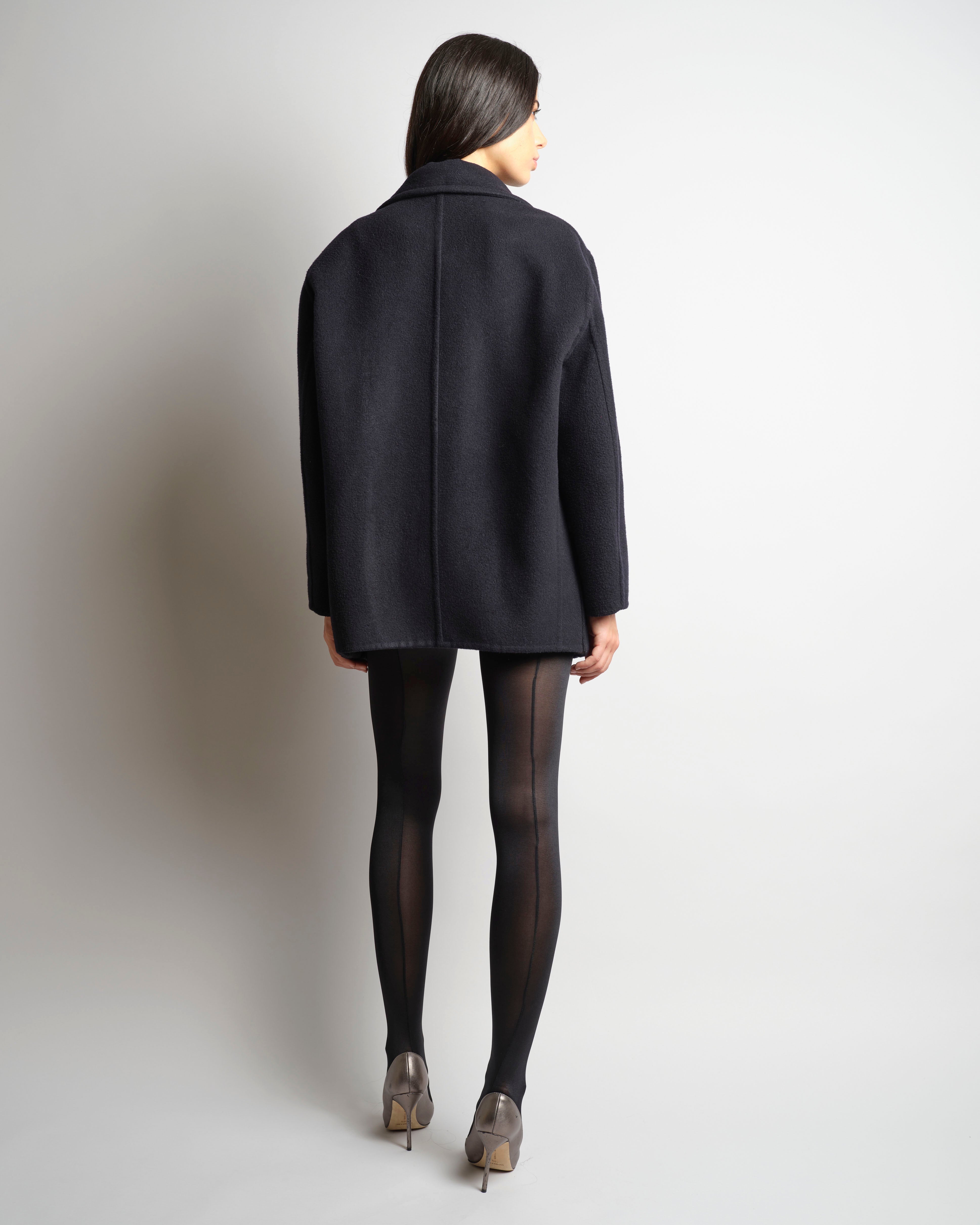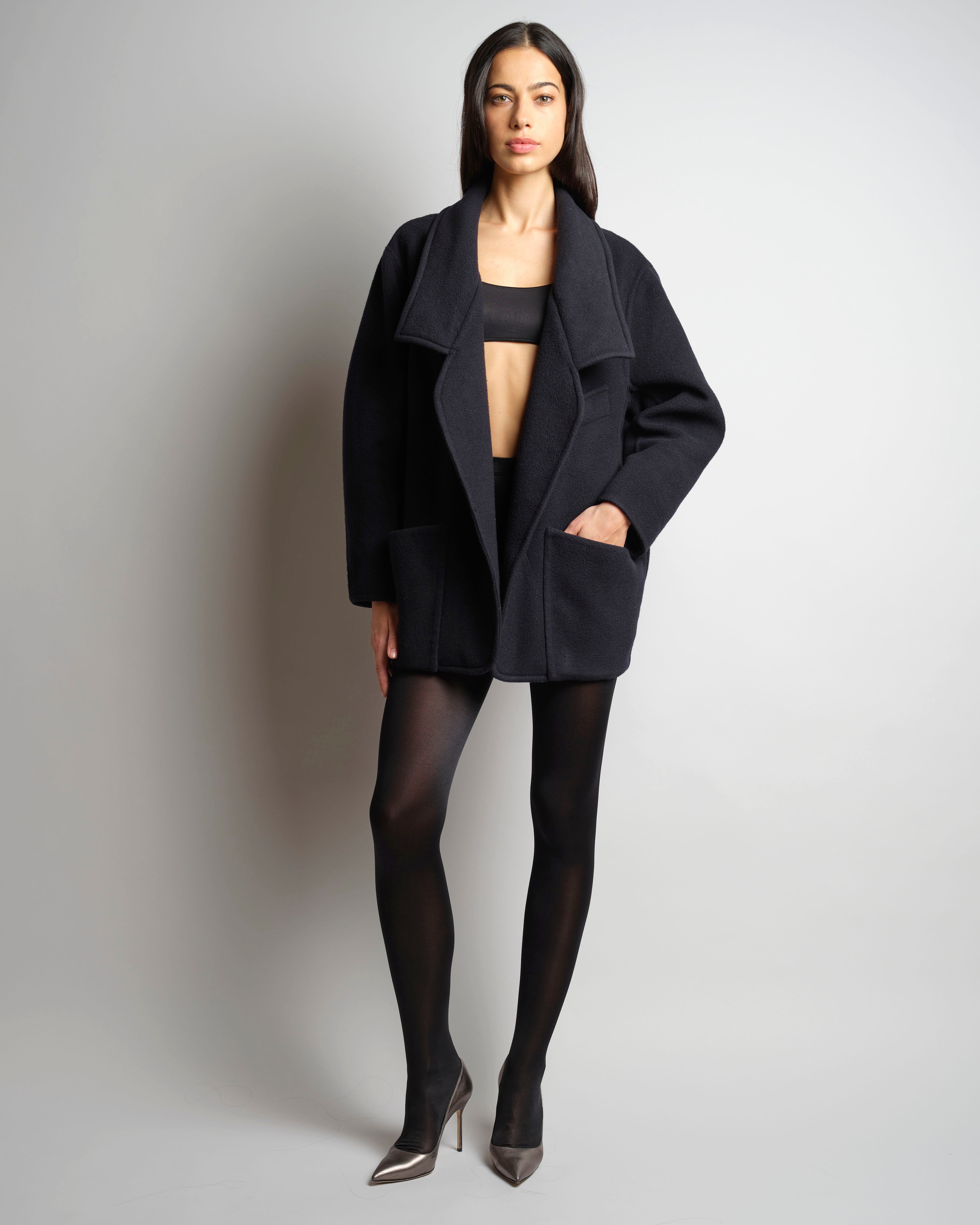 Handmade in Paris, the Henri Peacoat returns this season in bicolor After Midnight: a deep navy exterior combined with an elegant grey interior. The silhouette is structured yet fluid, with a lightly padded collar that can be worn up or rolled down. Designed without a fastening, it drapes close to the body when open or may be belted to define the waist. Front pockets complete the design.