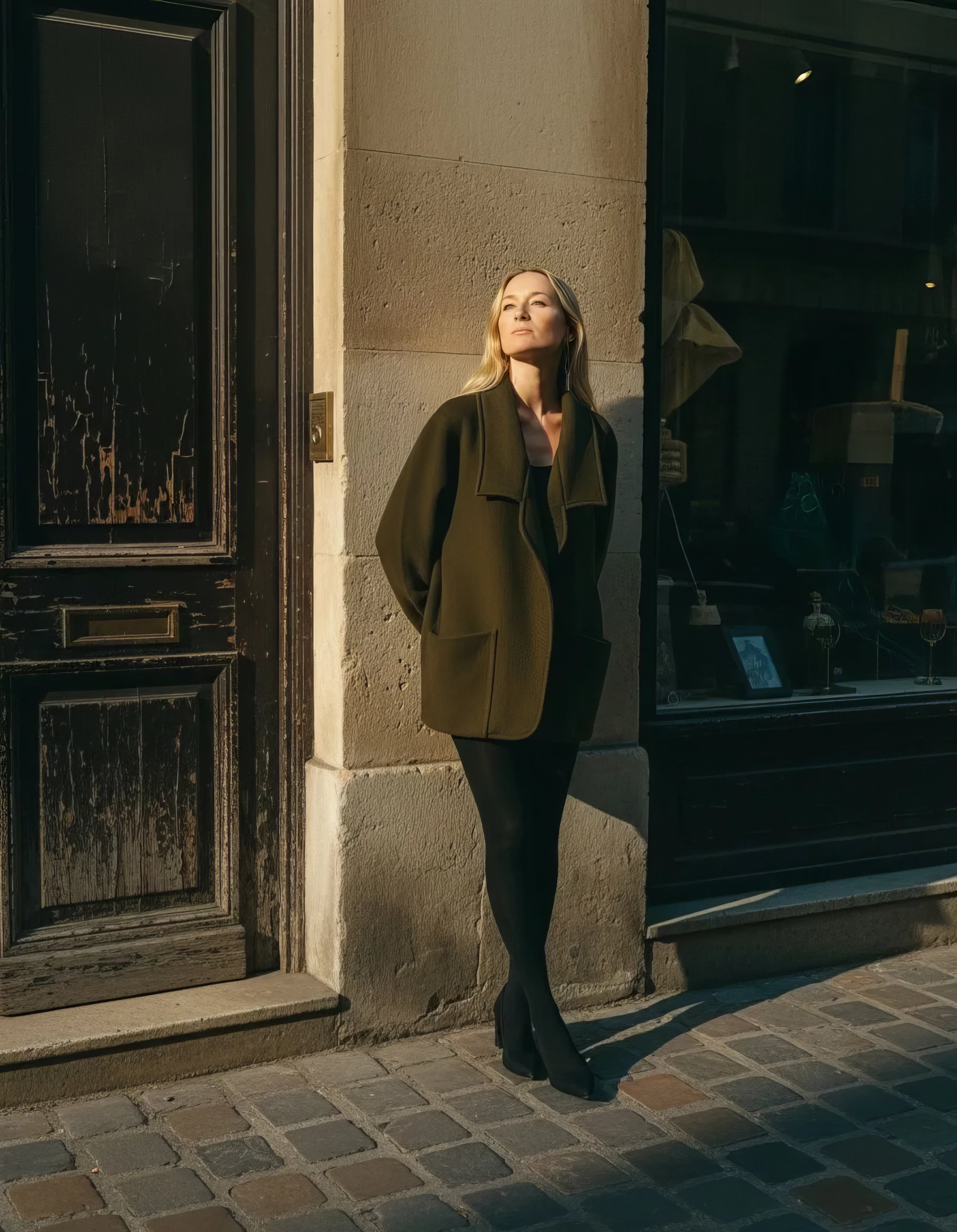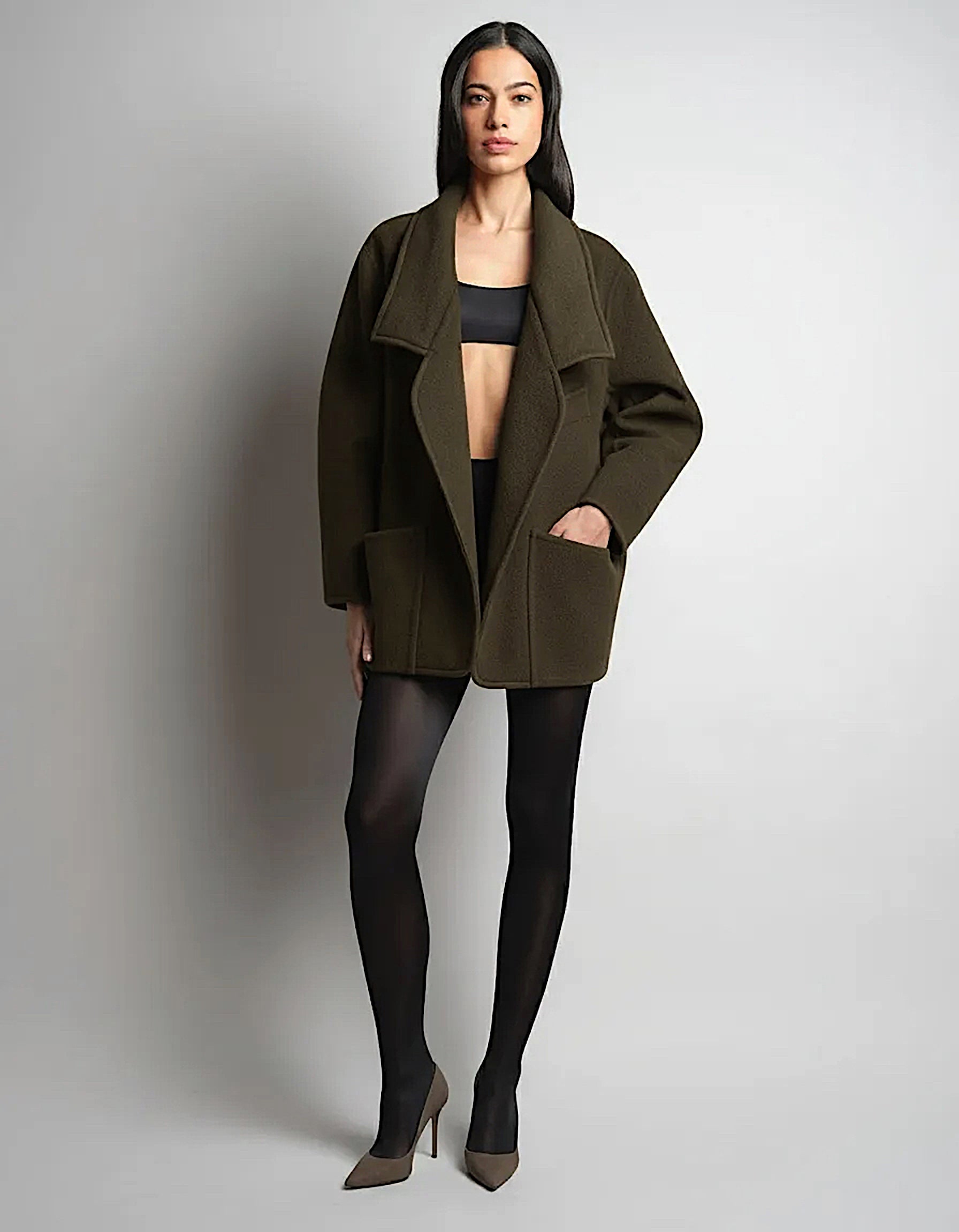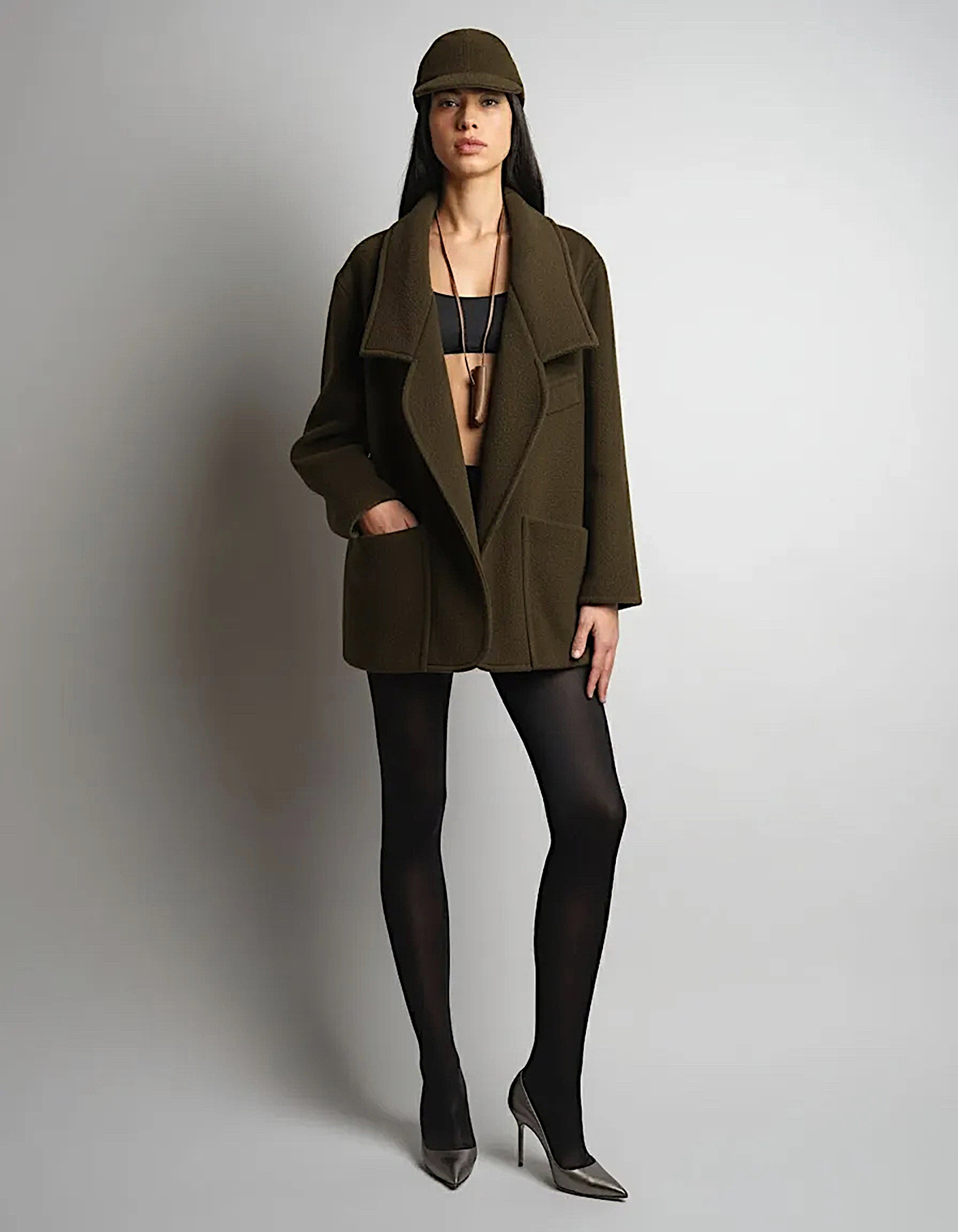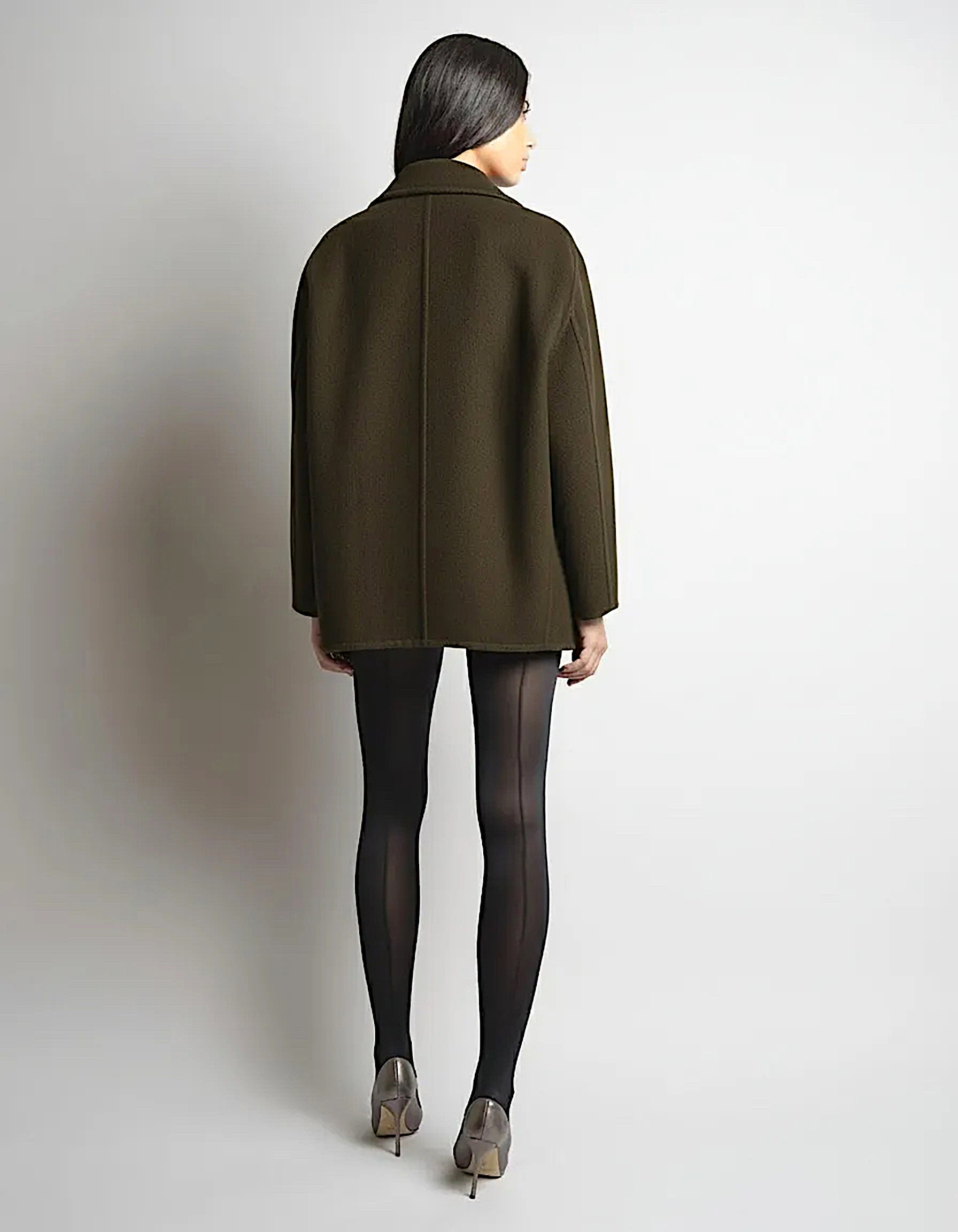 Handmade in Paris from double-face cashmere, the Henri Peacoat is reimagined this season in a new shade of Military Green. The silhouette is structured yet fluid, with a lightly padded collar that can be worn up or rolled down. Designed without a fastening, it drapes close to the body when open or may be belted to define the waist. Front pockets complete the design.