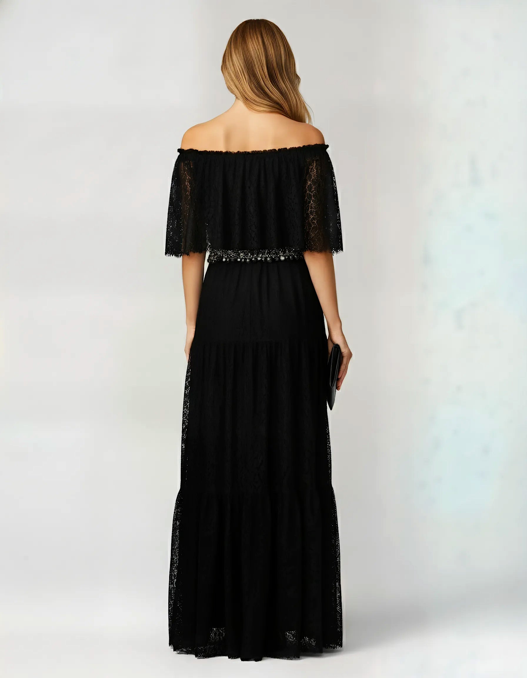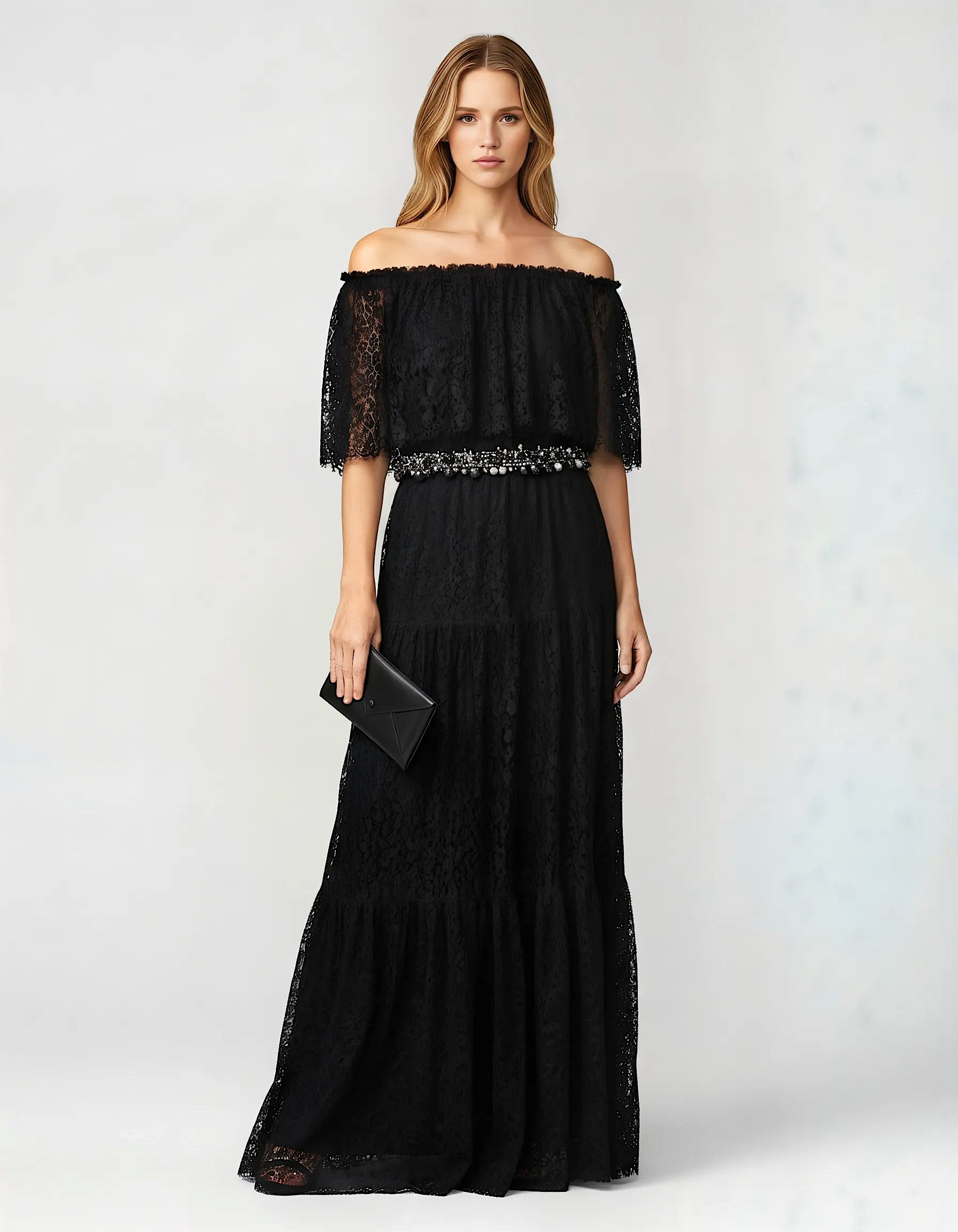 Handmade in France, the Jeanne Dress is crafted from intricately detailed black lace. The off-the-shoulder silhouette frames the neckline, while a sculpted bodice and fluid, softly flaring skirt create a harmonious balance of structure and softness. Each lace panel is meticulously placed, revealing the discipline and artistry of hand-crafted construction.