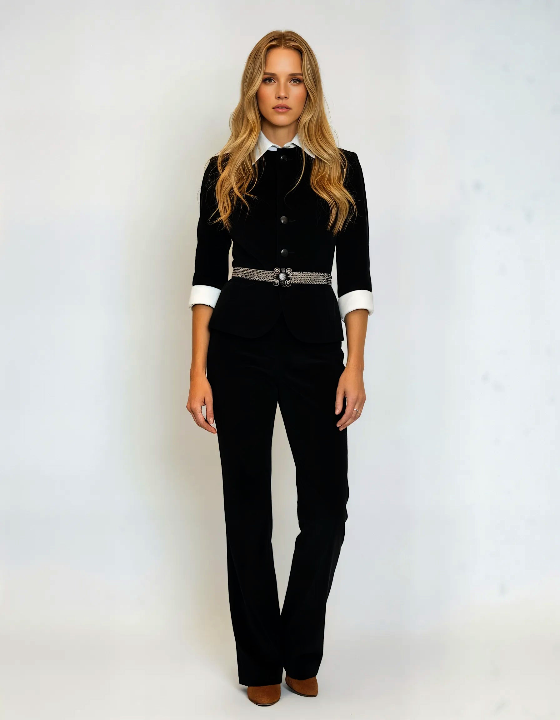 Crafted in Italy, the Micro Tuxedo is introduced this season in classic black. Made from cotton corduroy, the silhouette is sharply tailored yet fluid, balancing precision with comfort. Leather-covered buttons lend timeless sophistication, while discreet pockets preserve a clean, uninterrupted line.