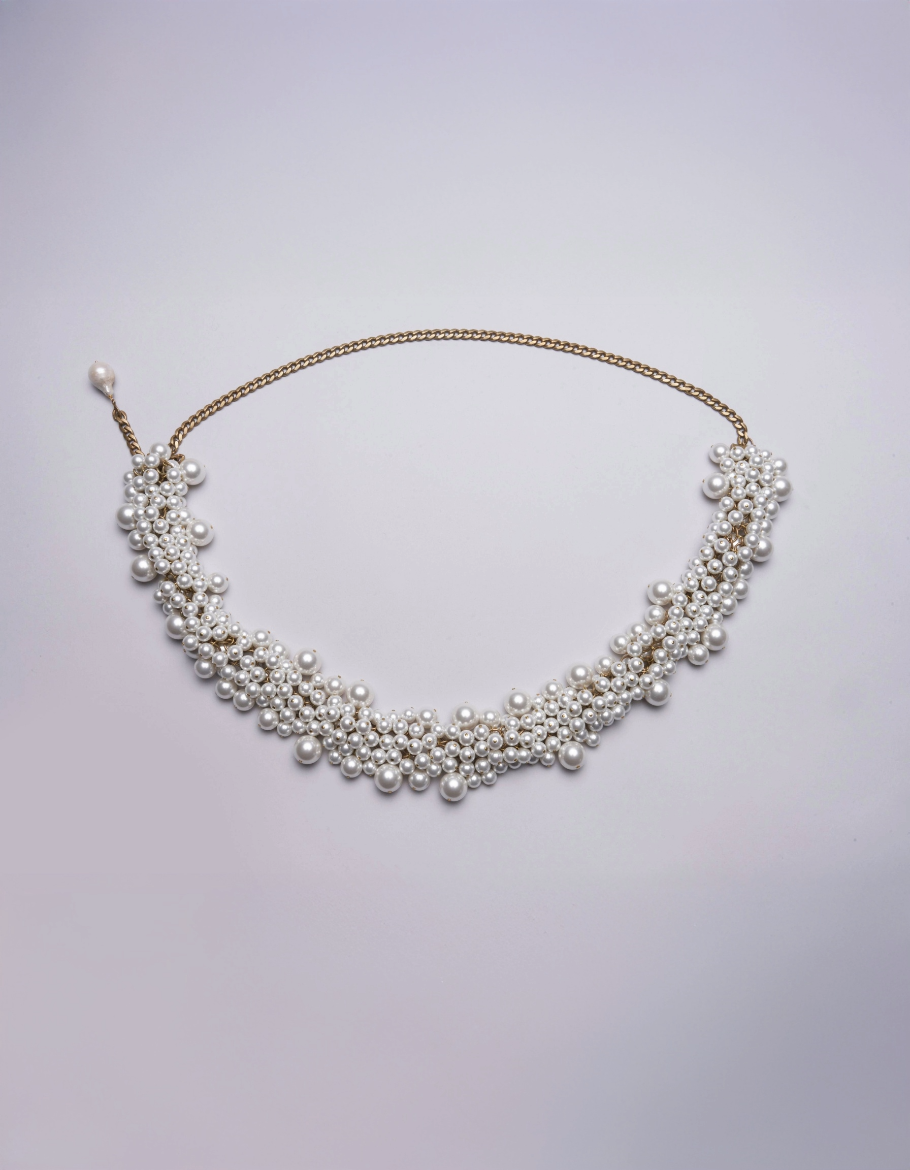 Handmade in Italy, this brass chain and white pearl belt is crafted with resin pearls and a nacre pendant.