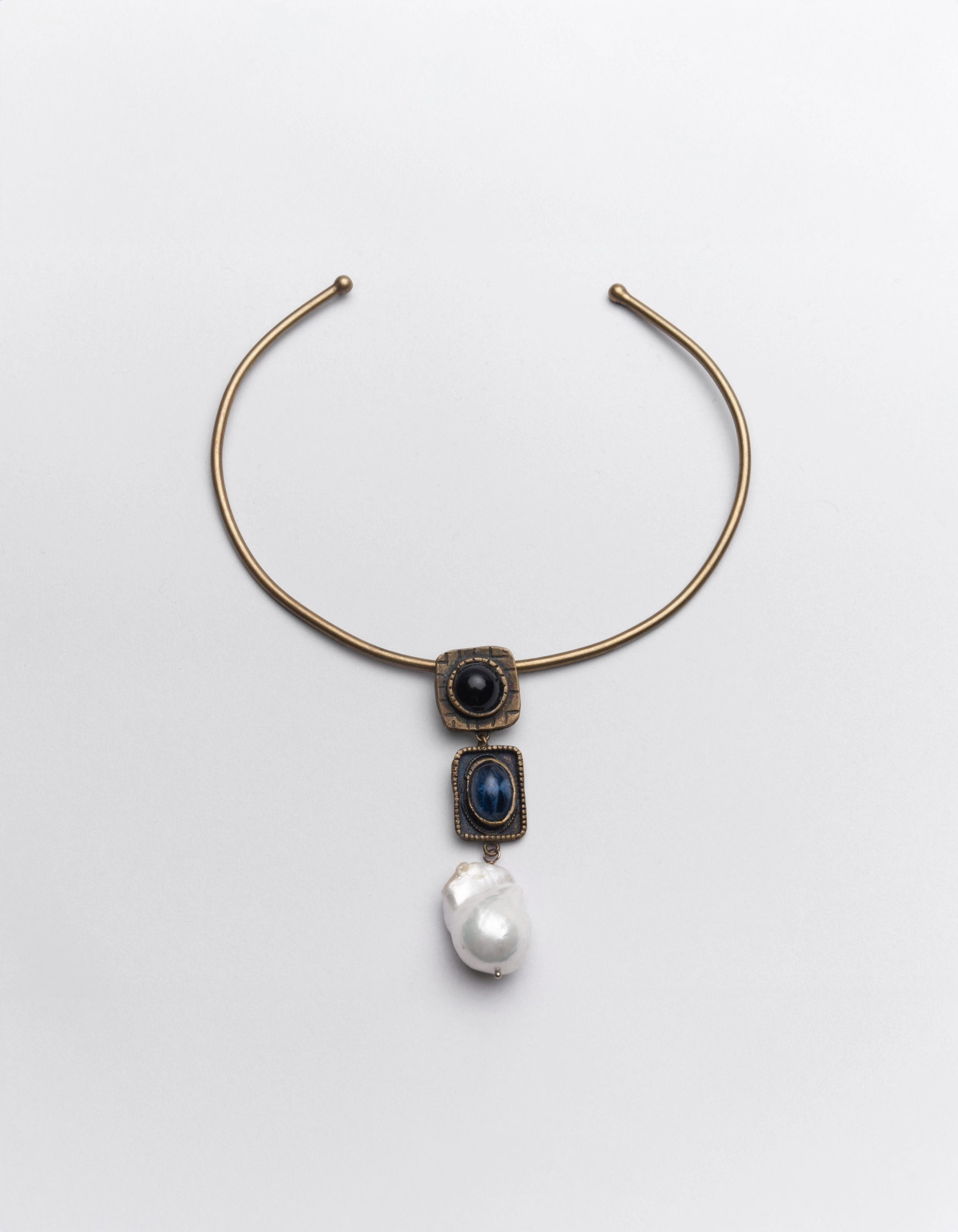 A brass choker featuring coloured glass and a natural baroque pearl, handcrafted in Italy.